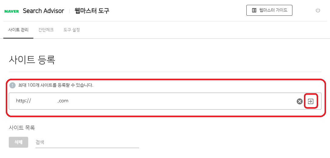 3. 빨간 박스에 본인의 티스토리 블로그 주소 혹은 외부 블로그 주소를 넣고 옆에 있는 화살표를 클릭합니다.