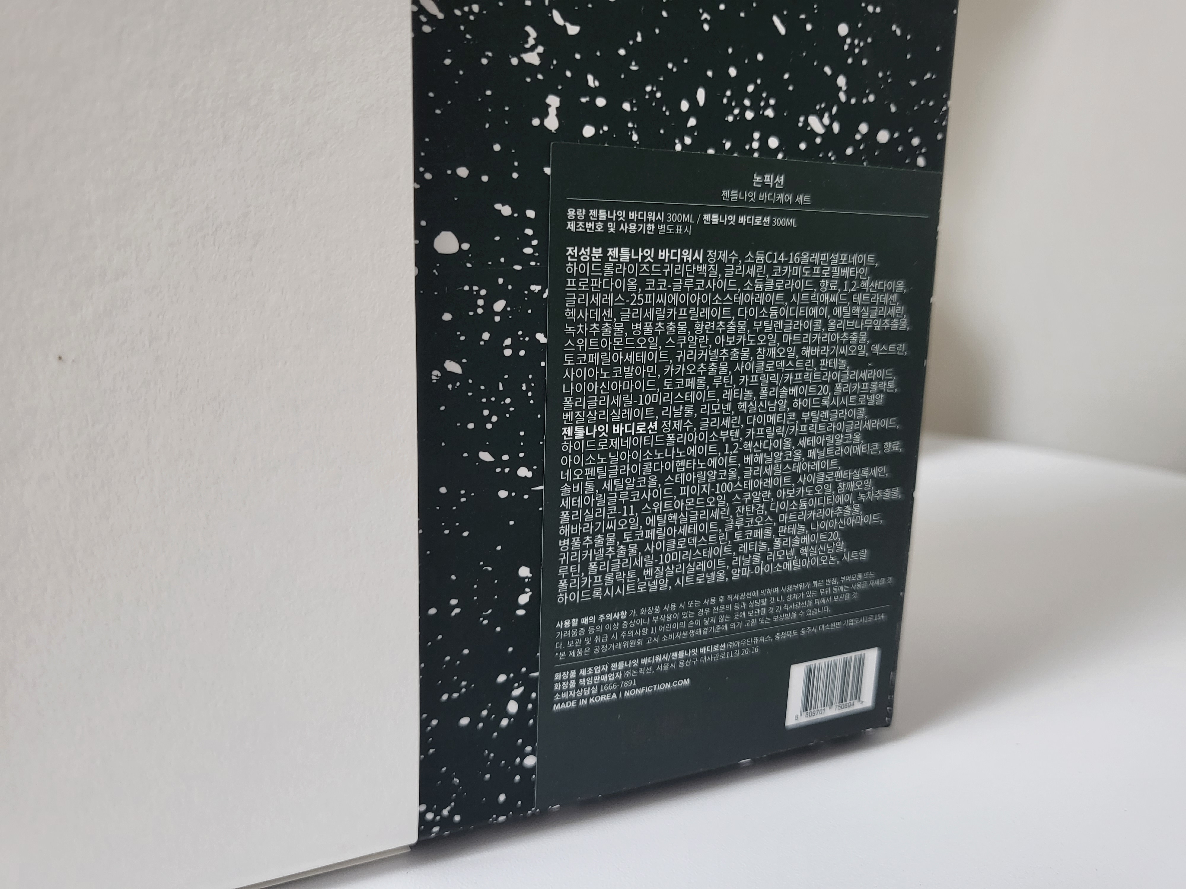 친한 지인으로부터 22년 10월경 카카오톡 통해 논픽션 바디워시&바디로션 세트를 선물 받았습니다. 6가지 여러 향 중 저는 젠틀나잇으로 선택했습니다. 이름만 들어봤지 사용은 해보지 않았어서 여러 후기를 찾아봐도 어떤 향일지 감이 오지 않아 그냥 제일 끌리는 이름으로 선택했습니다.