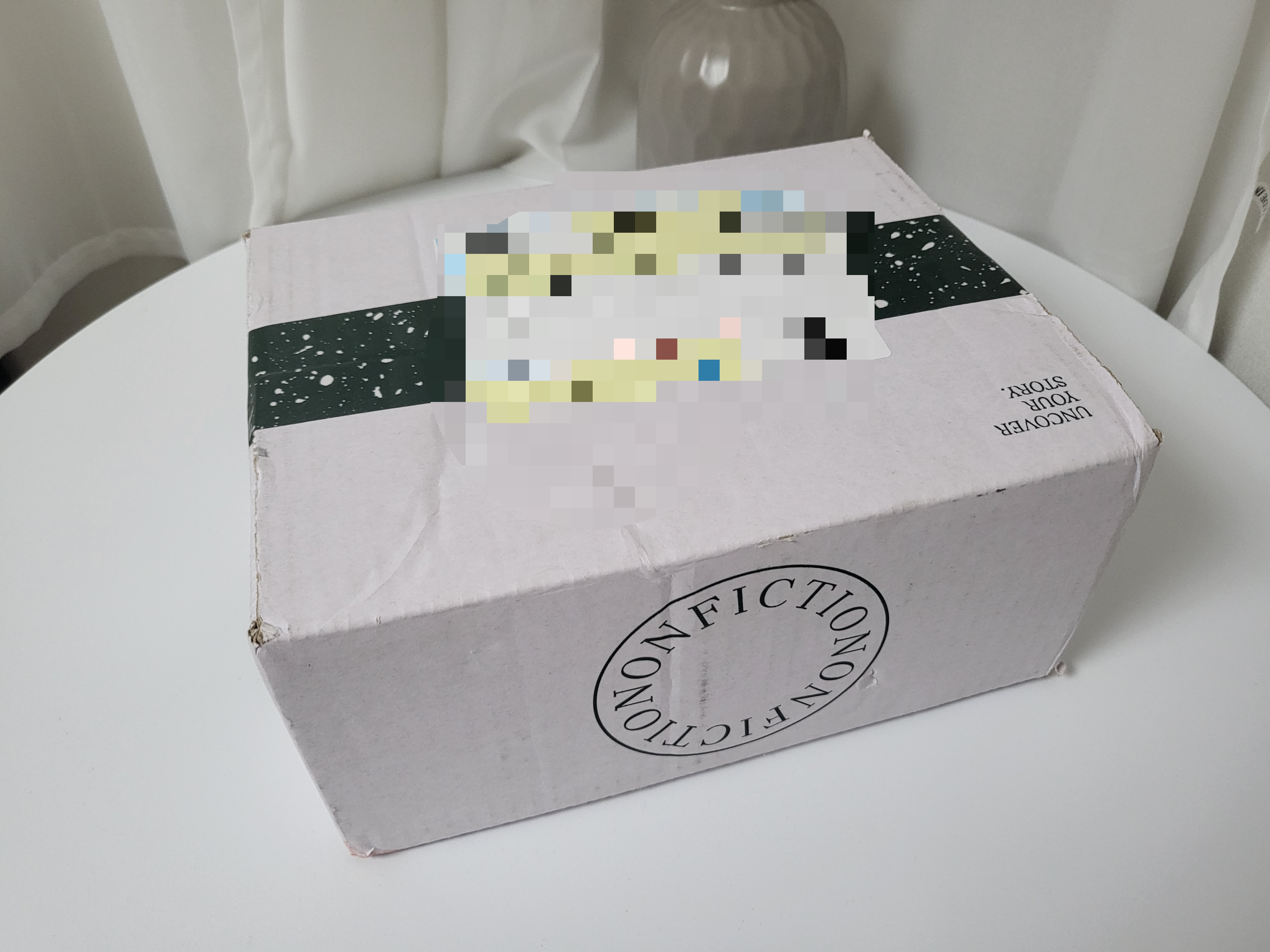 종이띠도, 논픽션 스티커도 제거해준 뒤 상자를 열어보니 흰 유산지? 같은 것으로 덮여 있지만 불투명이라 안에가 보였고요. 아래 사진과 같습니다.