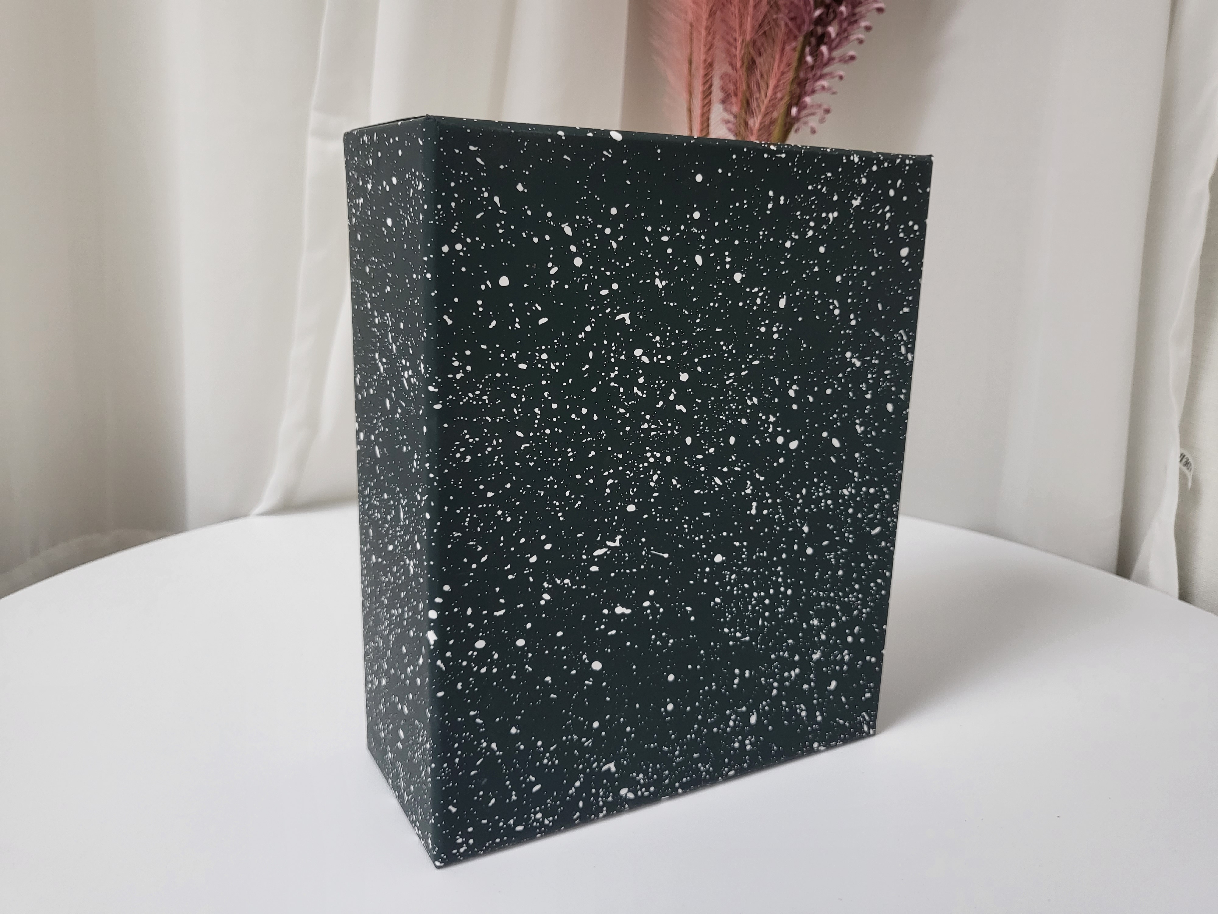 택배박스 안에는 깔끔하게 뽁뽁이로 감싸진 박스가 있었고 깔끔한 엽서와 함께 들어있었습니다. 뽁뽁이를 제거하고 보니 점이 흩뿌려진 무늬로 된 예쁜 박스였습니다. 지금껏 만져본 선물 박스 중 굉장히 단단한 박스였고 재질이 고급진 박스라 말할 수 있습니다.