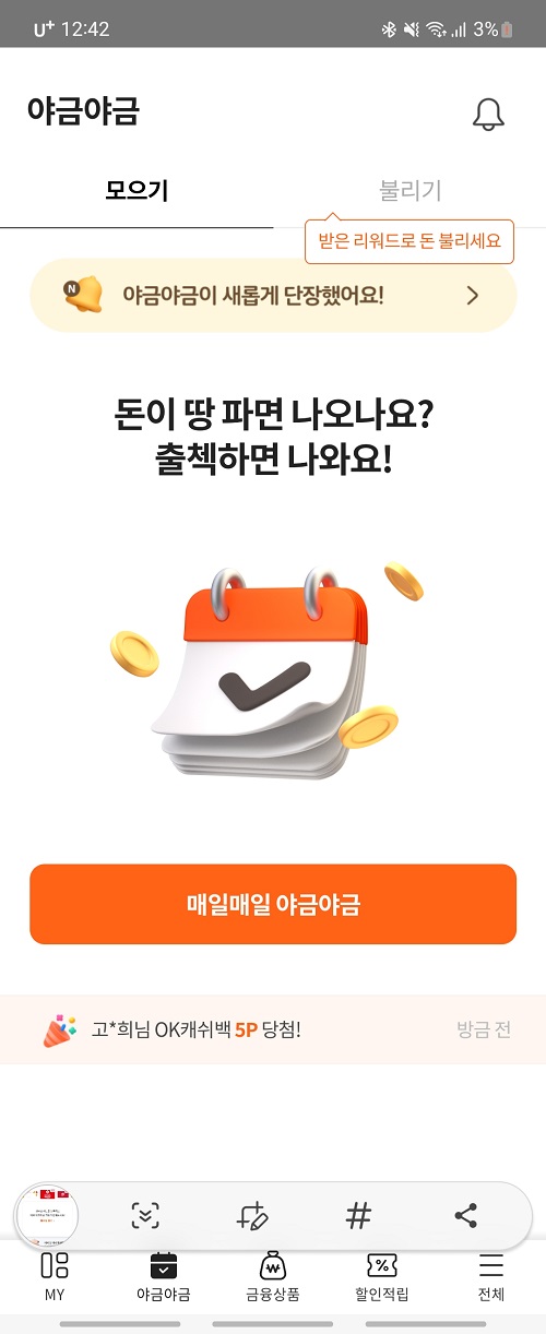 앱테크를 하는 분 들 중 오케이캐시백을 안 하는 분은 없을 거라 생각합니다. 생각보다 포인트가 잘 모아지며, 다양한 이벤트와 모은 포인트는 현금 전환이 가능하다는 메리트가 있기 때문일 겁니다. 그래서 저도 꼭 이용하는 앱테크 중 하나인데요. 나중에 오케이캐시백만을 위한 포스팅도 한번 해보아야겠습니다. 각설하고 오케이캐시백의 다양한 이벤트를 통해 모은 포인트와 타 어플을 통해 전환한 포인트를 합산하여 e금으로 투자가 가능합니다.