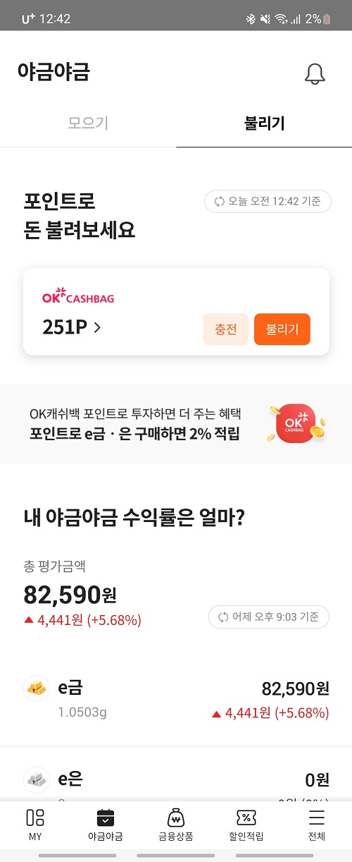 오케이캐시백을 통해 모아진 포인트를 불리기 페이지에서 불리기를 선택하여 투자를 하면 됩니다. 저는 e금을 했지만 원하시는 종목 선택하시면 됩니다. 요즘은 e은이 수익률이 높아서 저도 비율을 나누어해 볼까 생각 중입니다. 이미 알고 계시는 분들도 많으시겠지만, 모르시는 분들에게는 위 어플 통해 소소한 투자 해보시길 바랍니다.