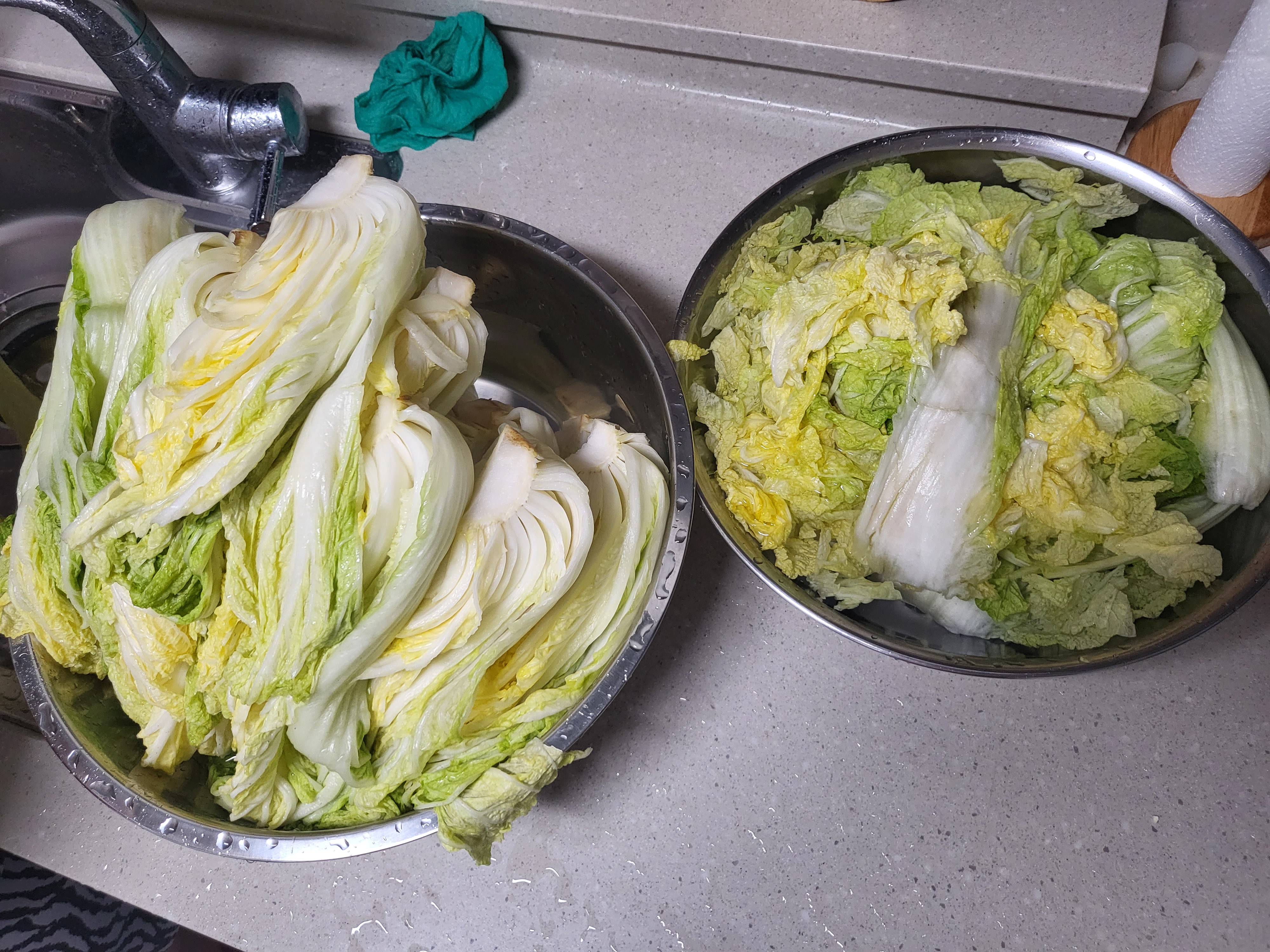 (알고 보니 2등분 후 중간에 칼집 내어 절이는 게 배춧잎들이 잘 안 떨어져서 모양 유지가 된다 하네요. 김장 다 끝나고 알게 돼서 저는 4등분으로 절였습니다. 잎들이 많이 떨어져 나가 내년에는 2등분 칼집으로 하려고요 ㅠㅠ)
