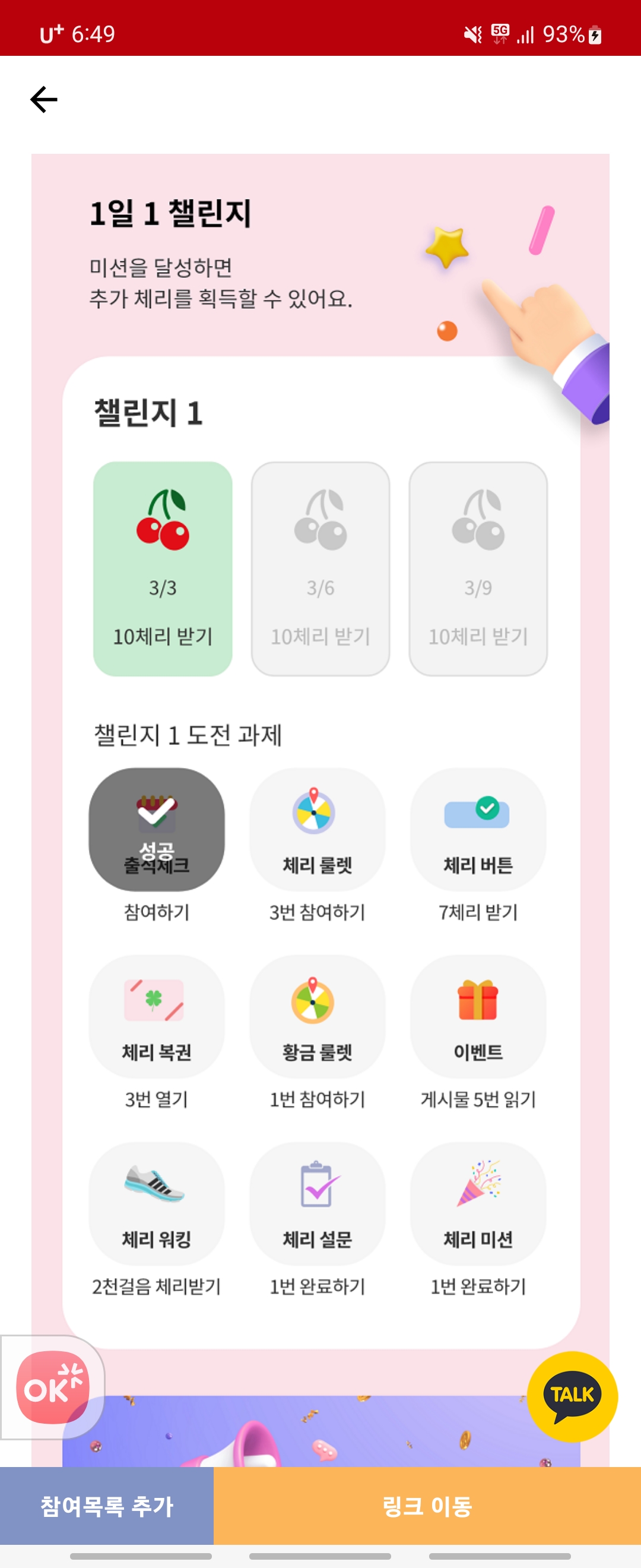 저는 하루 만보까지는 안돼서 대부분 총 25 체리만 받습니다. 타 어플(토스 등) 통해서 만보 하고 계시다면 추가로 체리콕까지 진행하시면 되겠습니다.