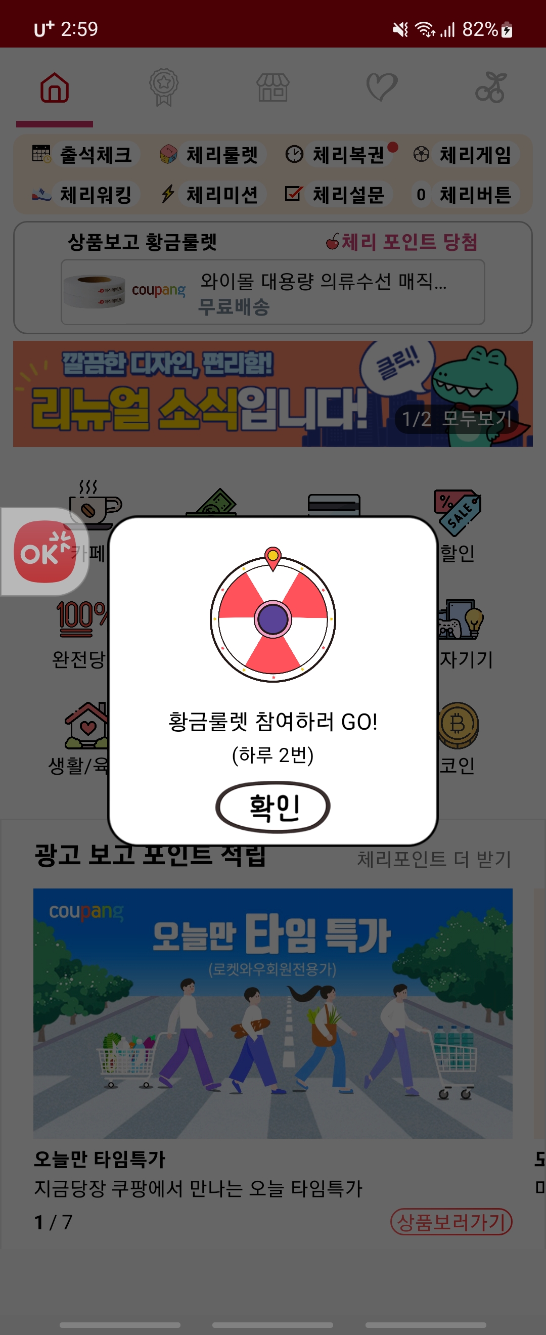 마지막으로 소개될 미션으로 메인화면 중간에 보시면 '상품 보고 황금 룰렛'이라고 있습니다. 이 배너를 클릭 시 쿠팡 광고로 이어지며 되돌아가면 3번의 체리 룰렛과 동일한 화면이 나오지만 이 미션은 현재 이용 가능합니다. 랜덤으로 포인트가 주어지며, 하루 2번 가능합니다. 연속으로는 안되며 텀을 두고 이용하시기 바랍니다. 저는 오전에 했으면 저녁에 한번 해주었습니다.