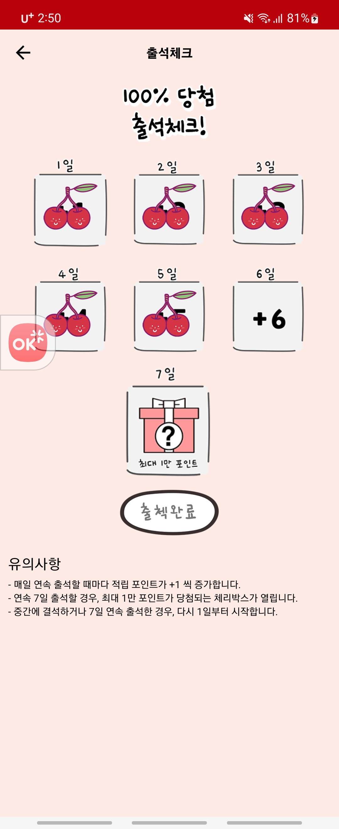 100% 당첨으로 일당 1포인트 증가(예:1일=1포인트, 6일=6포인트) 하여 제공되나, 마지막 7일째는 랜덤 포인트로 주어집니다. 최대 1만포인트라고 하지만 저는 10포인트 이상은 안됐던 것 같아요..ㅠㅠ 또한, 하루라도 결석 시 출석체크는 초기화되어 1일부터 다시 시작되니 이점 유의하세요.