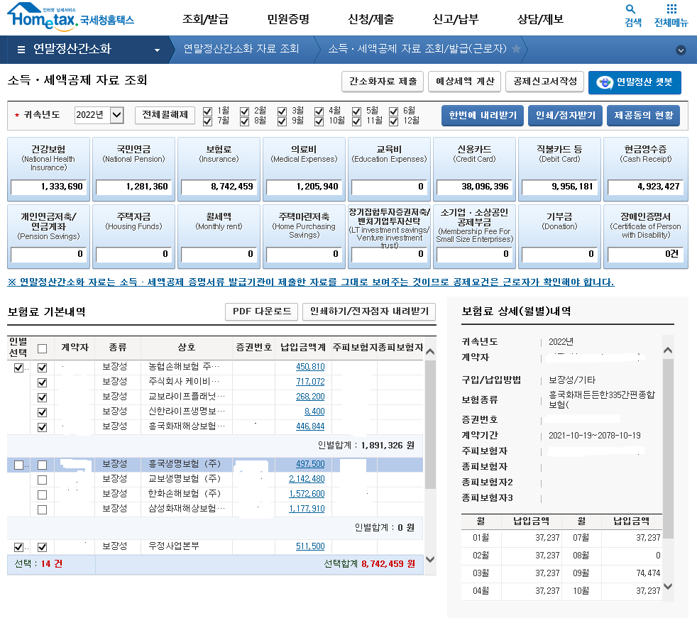 각 항목을 선택하게 되면 금액이 뜨고 아래로 내려보면 자세한 내역들을 확인할 수 있습니다. 예전부터 제공동의 현황을 통해 부양가족들 동의를 받아두어 자동적으로 뜨기도 하는데요. 매년 해당되지 않는 가족이 있다면 선택해제를 하면 금액이 자동 조정이 됩니다. 저희는 맞벌이라 남편은 해제했고요. 부모님은 확인 후에 넣을까 생각해 보았습니다.