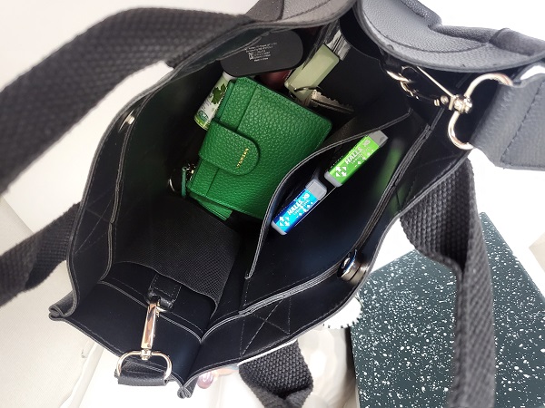 가방 내부도 물론 마감처리가 잘 되어있었습니다. 속주머니가 하나 있고요. 양 옆에 위아래가 뚫려있지만 무엇을 넣든 고정될 수 있게 포켓이 있고요. 탄성이 좋게 밴드소재로 되어있어 너무 큰 둘레의 텀블러가 아닌이상 텀블러도 충분히 넣어도 좋을 것 같습니다.