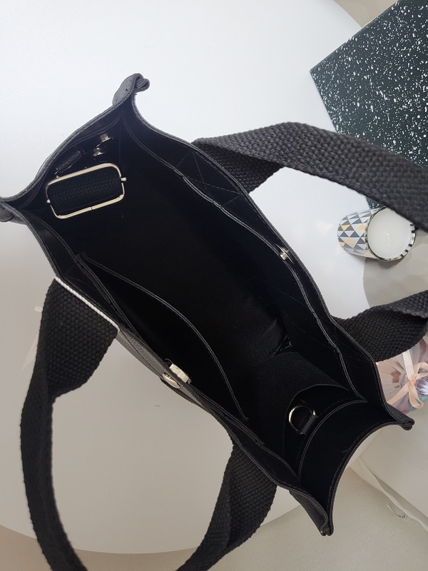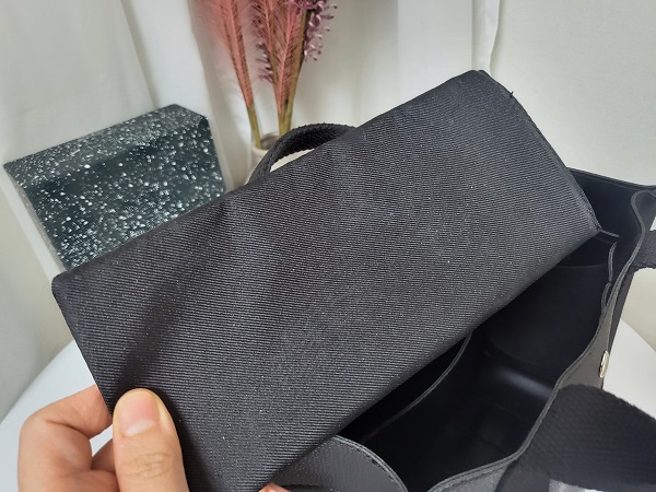 가방내부 바닥을 잡아주기 위해 패드도 있지만 밑면 패드는 살짝 저렴한 티가 나긴 합니다. 박음질이나 내구성이 좀 약하긴 한데 보이지 않는 부분이니 크게 신경쓰지 않아도 되지 않을까 생각합니다. 그리고 양옆고리가 있어 토트백으로도 들 수 있지만 숄더백으로도 들 수 있어 일석이조의 가방이라 볼 수 있고요. 물론 캔버스백이니 당연한 걸 수도 있지만요. 또 괜찮다 느낀 점이 고리의 색상이 골드가 아닌 실버라서 좋았습니다. 자칫 골드가 저렴해 보이는 경우들이 있는데 차라리 실버색상이면 그런 느낌이 덜하거든요. 고리 또한 줄꼬임이 없는 고리형식으로 되어있어 세심함이 보이는 가방이라 할 수 있겠습니다.